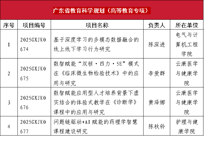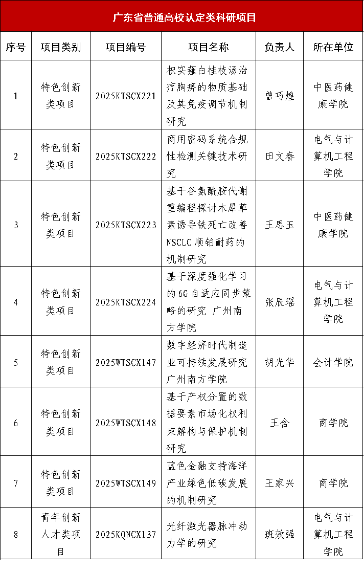 近日,2025年度广东省高等学校科研平台、项目,广东省教育科学规划课题(高等教育专项)立项名单相继公布,广州南方学院共获批18个省级项目。其中,广东省普通高校创新团队项目1项,广东省普通高校重点领域项目5项,广东省普通高校认定类科研项目 8项,广东省教育科学规划(高等教育专项)4项。