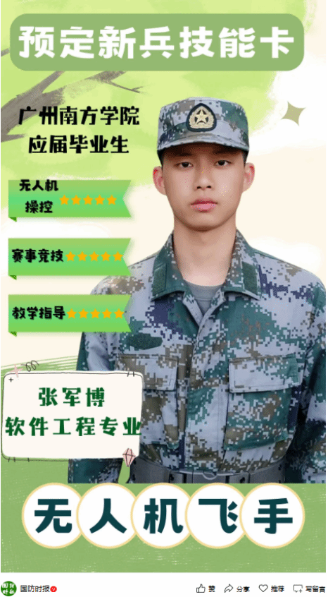 此外,我校2022级电气与计算机工程学院软件工程专业张军博同学在2026年度春季征兵中因专业技能突出受到关注。作为校航模队队长、无人机社团社长,他持有CAAC双执照及无人机驾驶员证,曾获全国智能无人机应用大赛二等奖、三维数字建模大赛华南赛区一等奖,并受聘为惠州联勤保障部队FPV教练,参与全军比武无人机教学工作。其事迹登载于“国防时报”微信公众号,并在送兵大会当天获广东新闻联播采访。