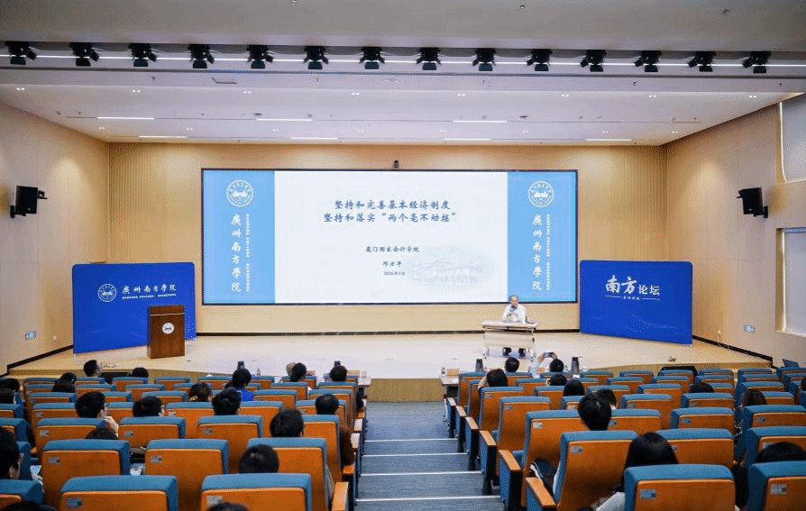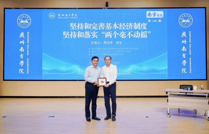 讲座伊始,邓力平教授从自身与广州南方学院的渊源谈起。他表示,自己早年间便对这所学校有所关注,此番应邀到访,对我校的办学规模、建设成效及校园文化氛围留下了深刻印象。结合民办高校办学实际,他指出,民办教育作为非公有制部门的重要组成部分,在中国特色社会主义制度安排中必须存在,并将不断发挥越来越重要的作用。他勉励师生深入了解我国基本经济制度,增强制度自信。