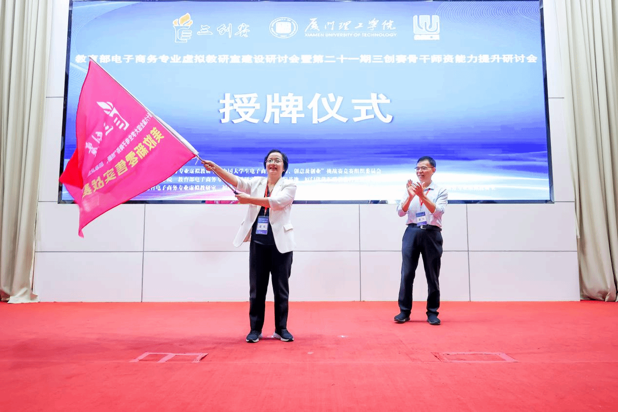 会议伊始举行了第十六届“三创赛”美妆新零售实战赛授旗仪式。我校作为该实战赛全国赛的承办方,由钟肖英处长代表学校从“三创赛”竞组委主席李琪教授手中接过赛旗。